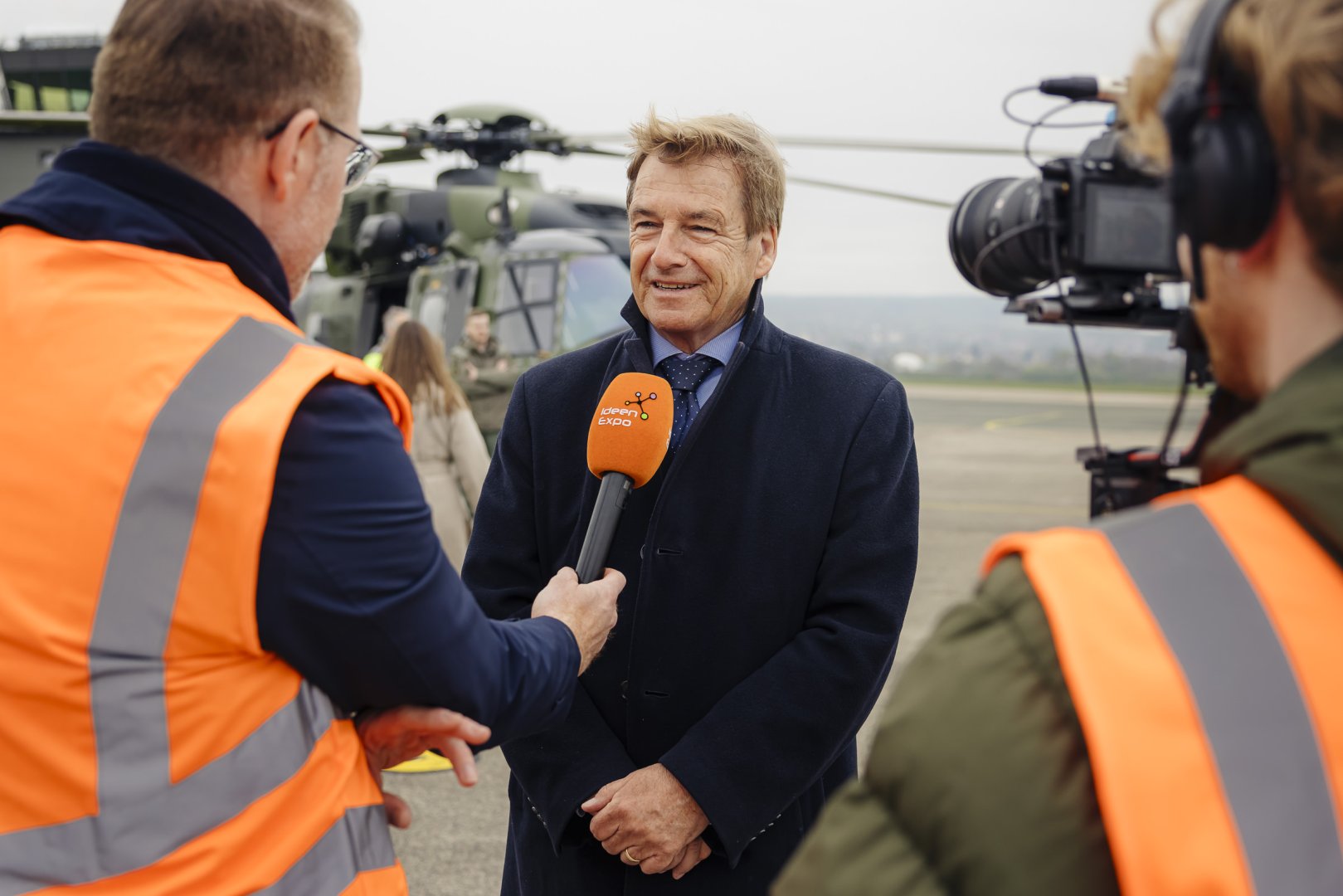 Im Vorfeld der IdeenExpo besuchte Dr. Volker Schmidt, Aufsichtsratsvorsitzender der IdeenExpo GmbH, den Heeresflugplatz in Bückeburg. Dort informierte er sich gemeinsam mit Medienvertreterinnen und Medienvertretern über die Ausbildung und die vielfältigen Berufsbilder der Bundeswehr in Bereichen wie Technik, Luftfahrt und Flugverkehrskontrolle.