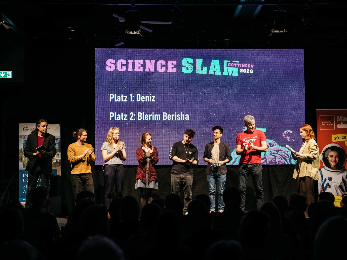 Am Ende des Abends entschied das Publikum über die Siegerinnen und Sieger. Deniz Gedik überzeugte mit dem Slam „Mit Lasern DNA-Schäden auf der Spur“ besonders und sicherte sich damit den ersten Platz. Gemeinsam mit Blerim Berisha und seinem Slam „Risikowahrnehmung – warum wir so häufig streiten“ qualifizierte er sich für das große Finale des Science Slams auf der IdeenExpo 2026.